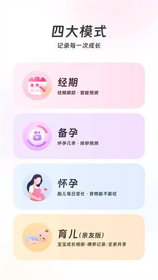 开启经期、备孕、怀孕、育儿四大模式。科学备孕,排卵日一查便知;健康怀孕,知识每日推送,食物能不能吃一查便知;育儿护航,记录宝宝成长每一刻。陪伴你从校服到婚纱,从少女到当妈,不同时期给你特殊的照顾。