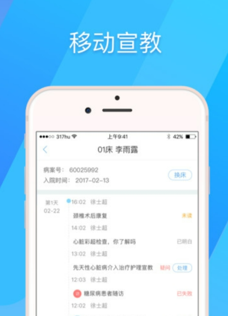 317护秉承“让知识传递关爱”的理念,基于互联网信息化方式,创新「患者宣教」和「护士培训」两大功能服务,致力于减轻护士宣教负担、革新传统护士培训学习方式,帮助医院轻松实现宣教和培训全流程闭环管理。同时,「317护」云集全国资深护理专家团队,打造海量患者宣教、护士培训课程,创新护理知识共享圈,共同促进优质护理服务。