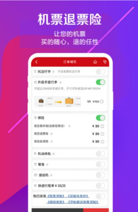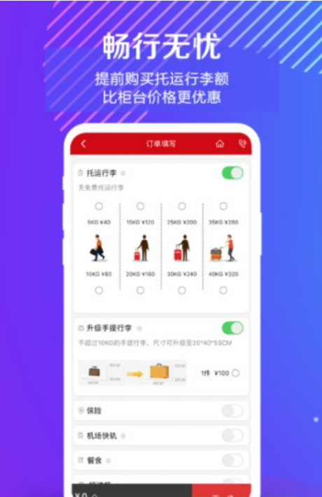 可在机票预订页面、增值服务购买页面、订单管理页面三个通道实现您行程中行李、餐食等附加服务的选购。
