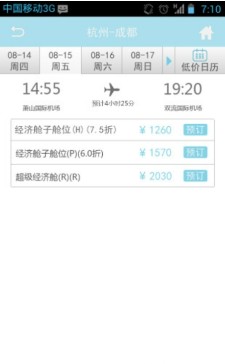 3、机票一键预定,大家在这里可以预定单程和往返的机票,只需要输入相应的出发城市,到达城市和出发时间,舱位即可。